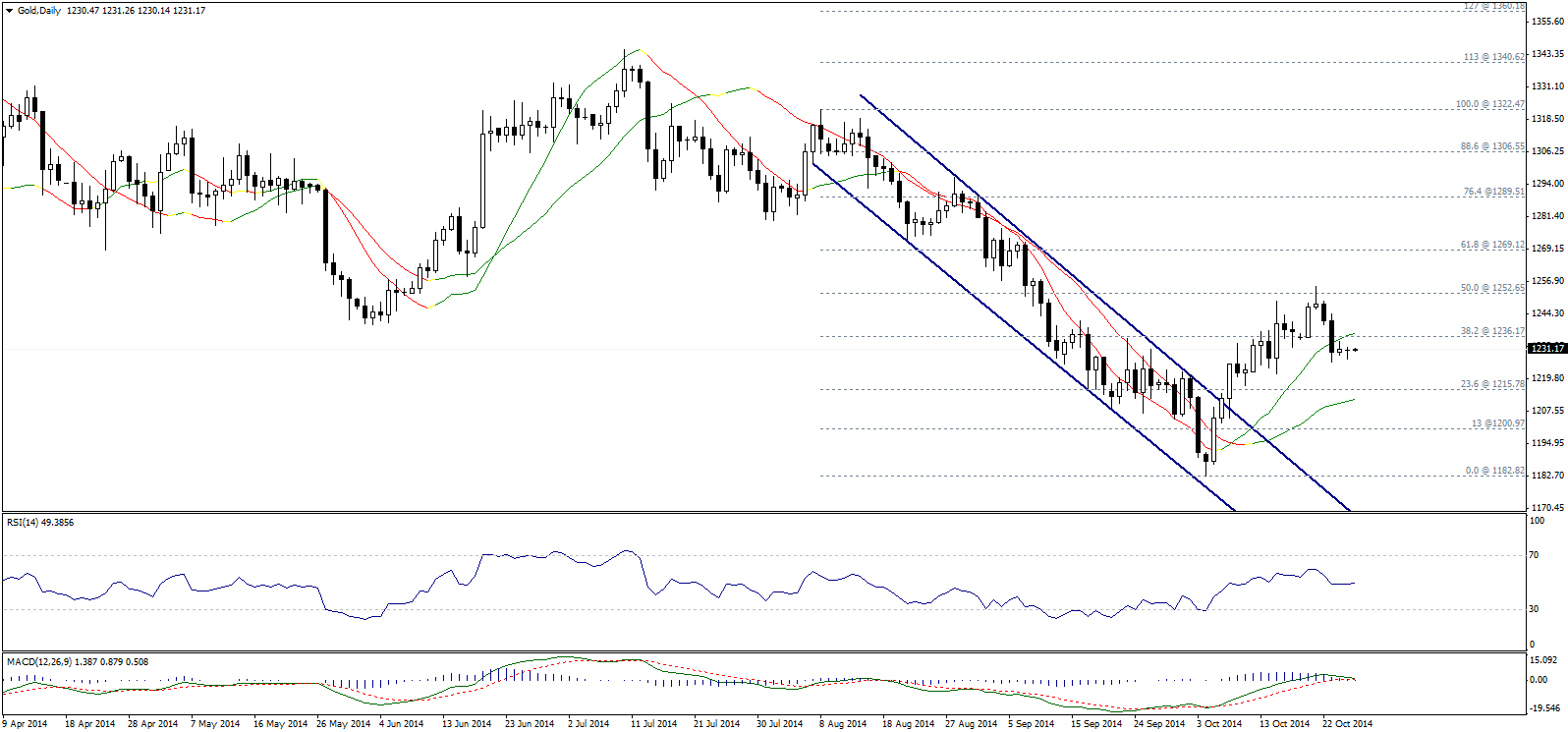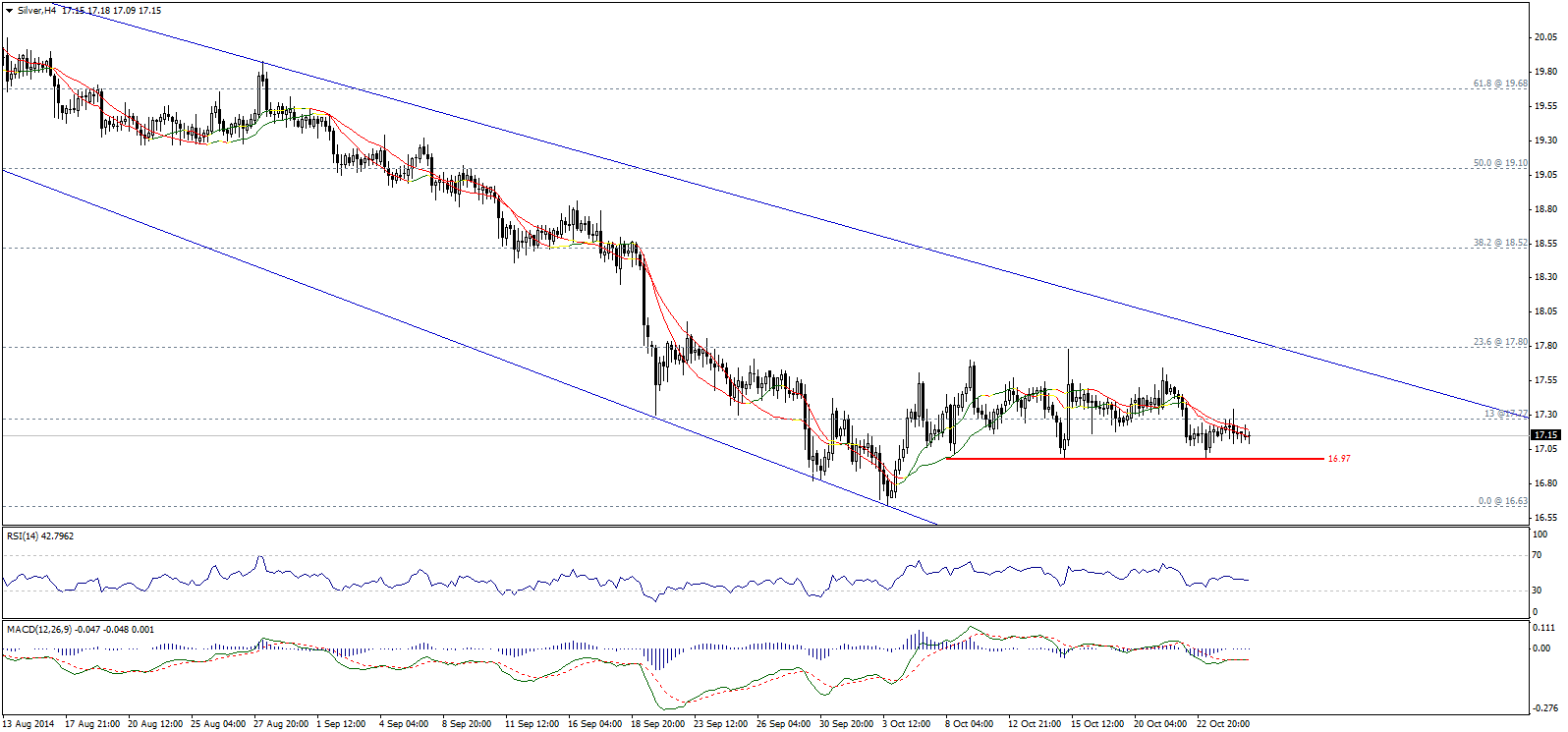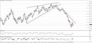Металл начал торги этой недели торговлей ниже уровня 38,2% коррекции Фибоначчи (1236,15) и ниже линии Линейной регрессии 34 и мы так же замечаем слабость индикаторов MACD и RSI. Тем не менее линии Линейной регрессии показывают положительную динамику, а торги идут выше уровня поддержки 1215,75, что делает коэффициент риск/вознаграждение неуместным и заставляет нас оставаться вне рынка.