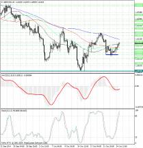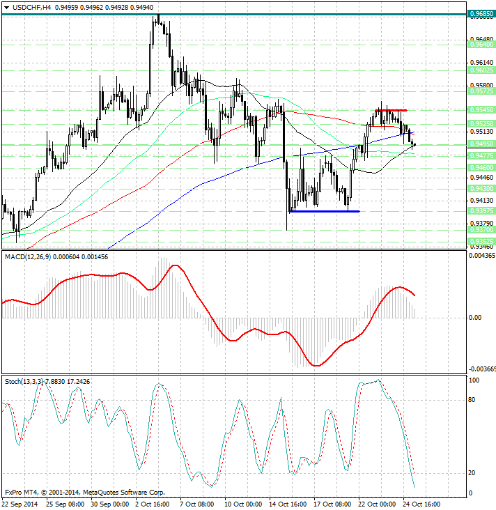 Курс валюты зажат между скользящих средних с периодами 89 и 144 (уровень сопротивления 0.9510/125) с одной стороны и средней с периодом 55 (уровень поддержки 0.94825) с другой, и в данный момент слился со средней с периодом 34.