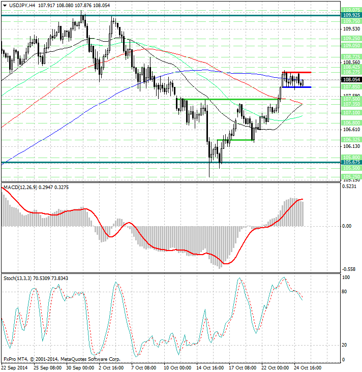 Обратив внимание на 4х часовой график можно заметить, что с прошлой пятницы торги не выходят за рамки узкого ценового диапазона 108.275 - 107.85.