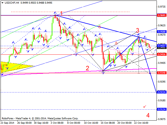 Валютная пара доллар франк торгуется с понижением. На сегодня рассматриваем отработку уровня 0.9455. Далее ожидаем возврат к уровню 0.9500. Затем рассматриваем возможность снижения к уровню 0.9350. На пробое этого уровня ожидаем развитие консолидации с фигурой продолжения снижения. Цель отработки третьей волны - на уровне 0.9135.