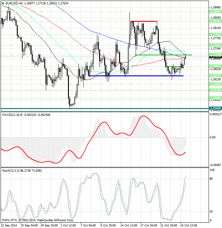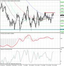 Курс валюты расположен немного ниже скользящих средних с периодами 34 и 55 (уровни сопротивления 1.2710 и 1.2725) и в данный момент практически слился со средними с периодами 89 и 144.