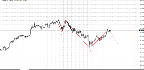 Внутреннее волновое строение четвертой волны получилось сложным и похожим на один коррекционных треугольников. Была предпринята попытка пробить уровень 105.50, оказавшаяся неудачной, что могло привести к окончанию построения волны.