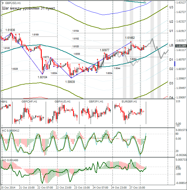 Курс евро/доллар обновил максимум, но идёт вверх пока тяжело. Если вчерашний максимум 1,2722 будет обновлён, между ценой и индикатором АО сформируется медвежья двойная дивергенция – сигнал продаже евро. В связи с этим по основному сценарию на вторник рассматриваю возвращение евро к 1,2666.