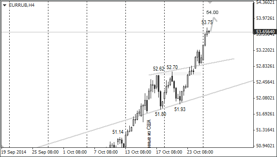 Учитывая, что евро и доллар каждый день обновляют новые максимумы, то понятно, что у рублёвых пар нет исторических уровней сопротивления, на которых бы они могли остановиться. Приведу лишь технические уровни и даты, где может падение российской валюты может затормозиться: 42,85 – 30 октября, 45 ровно – 30.декабря и 46,30 – конец февраля. На вторник цель по евро – 54, доллару - 42,60.