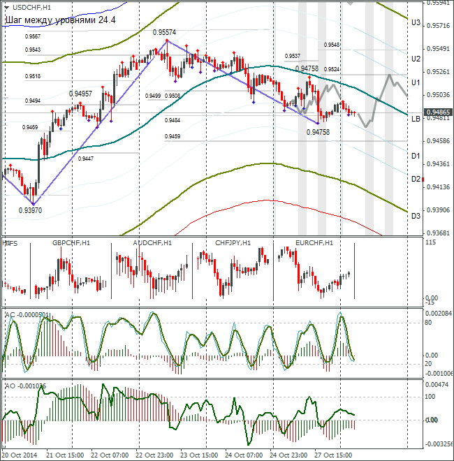 Курс USD/CHF скорректировался с максимума 0,9557 на 67 градусов к 0,9484. На вторник жду восстановление пары до 0,9524. Учитывая, расположение индукторов АО и стохастика, считаю свой сценарий идеальным для сегодняшнего дня.