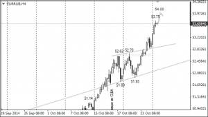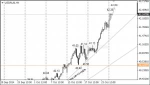USD/RUB продолжила движение вверх в понедельник, отметив исторический максимум 42,28 на осознании рынка, что «добрых отношений» между Россией и Западом после «валдайской речи» Владимира Путина ждать не стоит. Похоже, санкции отменять никто в ближайшее время не будет, а это значит, что мощнейший фактор поддержки рубля нескоро выйдет на сцену. Единственным сценарием, при котором мы ожидаем некоторой коррекции пары в район 41,50, может является результативное завершение газовых переговоров с Украиной, назначенных на 29 октября.