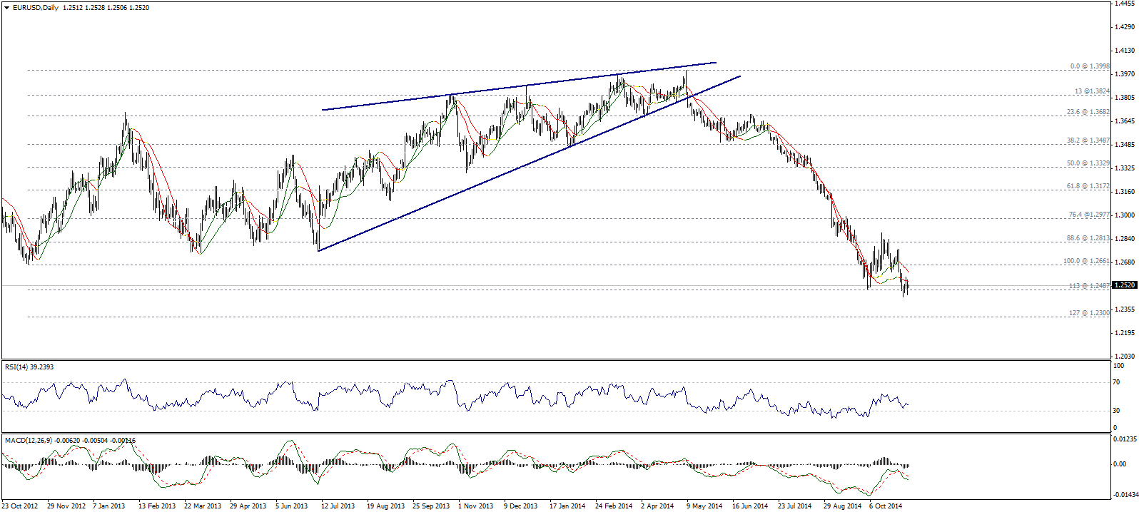 Пара не смогла закрепиться ниже уровня 1,2485 (113% коррекции Фибоначчи) и в настоящий момент торгуется вше него. Тем не менее, линии Линейной регрессии и MACD по прежнему показывают отрицательную динамику, что заставляет нас оставаться медведями по паре и ждать повторную попытку пробоя вышеупомянутого уровня. Имейте ввиду, что сегодня состоится пресс-конференция ЕЦБ, которая может вызвать сильные колебания на рынке.