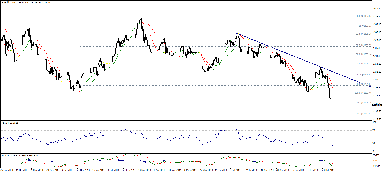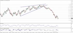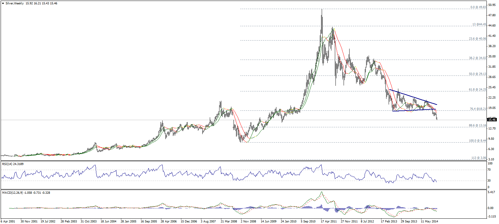 Золото резко снизилось пробив область поддержки 1155,75, что указывает на дальнейшее снижение металла с целью 1127,00 (127% коррекции Фибоначчи). Этот сценарий так же поддерживают линии Линейной регрессии сформировавшие отрицательный кроссовер. Что касается других технический индикаторов, RSI находится в области перепроданности, но не проявляет какой-либо положительной активности, а MACD показывает отрицательную динамику поддерживая наш медвежий сценарий.