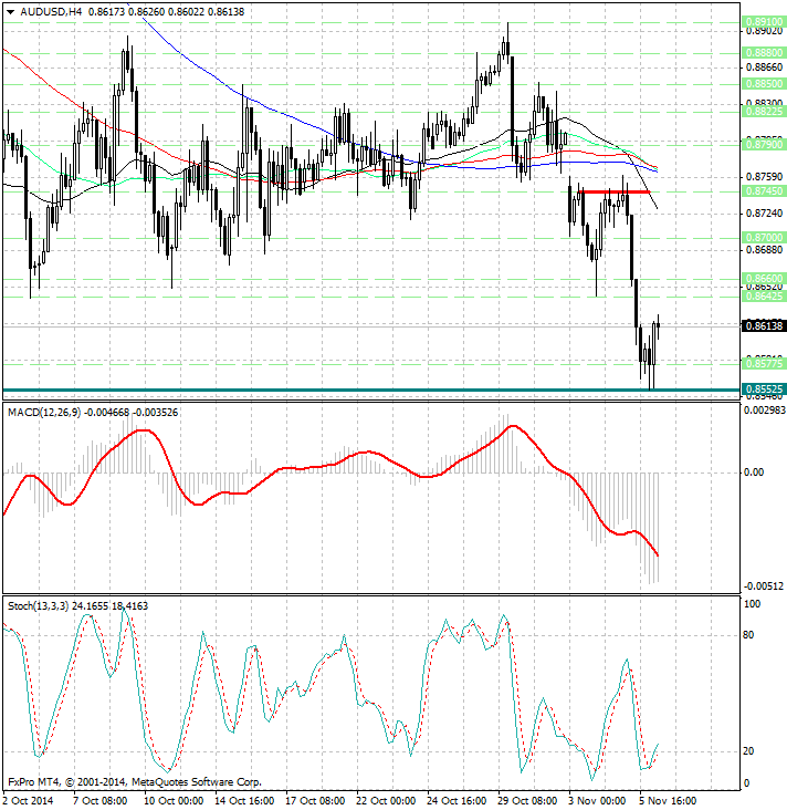 Обратив внимание на 4х часовой график можно заметить, что австралийский доллар (AUD) нашел ощутимую поддержку возле уровня 0.85525 (область 3-летних min), после чего началась коррекция, которая продолжается до сих пор...