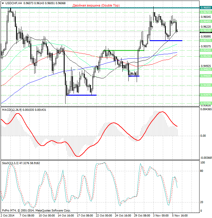 Курс валюты по-прежнему расположен существенно выше скользящих средних с периодами 55, 144 и 89, которые направлены вверх и указывают на сохраняющиеся бычьи настроения (в среднесрочной перспективе), а также являются рядом уровней поддержки 0.9565, 0.95375 и 0.9530, и в данный момент пытается закрепиться ниже средней с периодом 34.