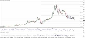 Гистограмма MACD расположена в отрицательной зоне и ниже своей сигнальной линии, но начала очень плавно повышаться и тем самым указывает на возможное усиление бычьих настроений.