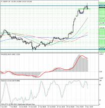 Гистограмма MACD по-прежнему расположена в положительной зоне, но ниже своей сигнальной линии, продолжает плавно снижаться и тем самым подает сигнал на продажу USD/JPY.