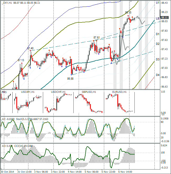 Как и ожидал, американский доллар укрепился после выступления М.Драги. Индекс доллара повышался до закрытия торгового дня без подготовки к пейролсу. День закрылся выше 88 пунктов.