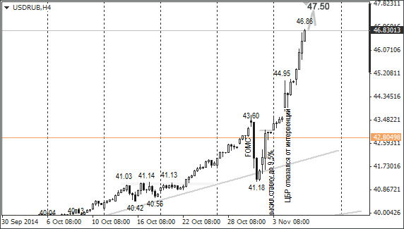 Отметку в 48 рублей я ожидал увидеть к концу февраля 2015 года. В четверг был установлен максимум 46,86. Учитывая, что без ЦБ внутридневная волатильность с 30-40 копеек выросла до 100-150 копеек, то от 46,80 ожидаю рост до 47,50/80. По евро/рублю ожидаю рост до 58,50/80.
