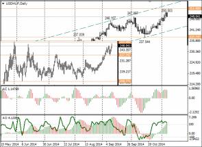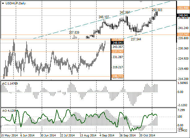 Торговые возможности по валютной паре: курс USD/HUF имеет положительную корреляцию с USD/RUB. Если на рынке форекс по доллару и рублю начнётся коррекция, можно присмотреться к коротким позициям с целью до 243,50. Срок жизни идеи до конца ноября. Отменится она при закрытии дня выше 250,50.