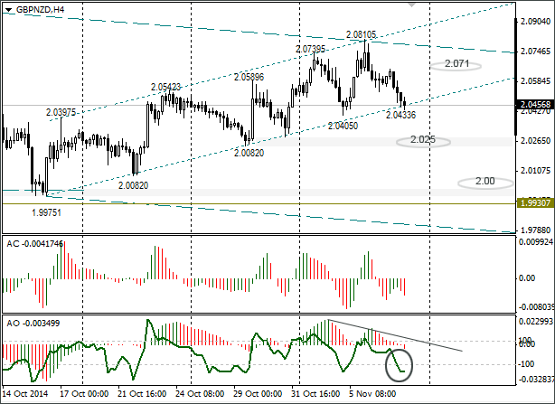 Торговые возможности по валютной паре: GBP/NZD пытается пробить трендовую линию. В пресс-релизе РБНЗ отмечается, что в октябре месяце темпы роста новозеландской экономики были существеннее, чем в течение 2014 года. Если падение цен на нефть остановится на время, то при текущем положении дневных и недельных индикаторов падение фунта ускорится.Срок жизни идеи – одна неделя. Закрытие свечи выше 2,050 поставит идею под сомнение.