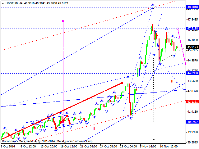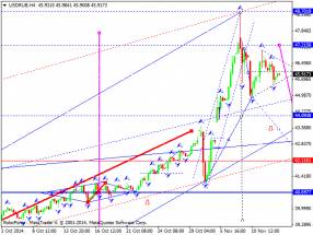 Российский рубль продолжает торговаться в центре волны на снижение. На сегодня рассматриваем выход из этой консолидации вниз на отработку уровня 43.36. Далее ожидаем возврат к уровню 46.00. Затем будем рассматривать развитие третьей волны на снижение.