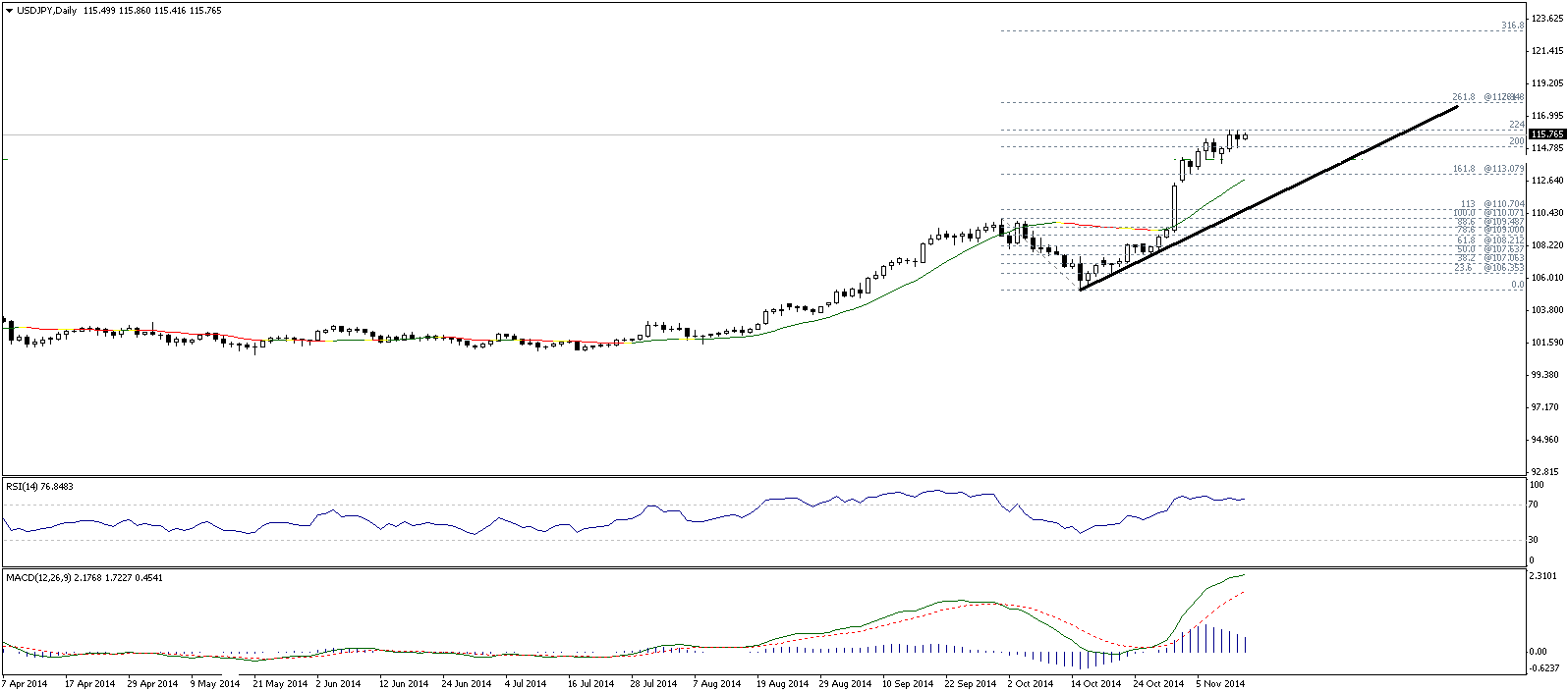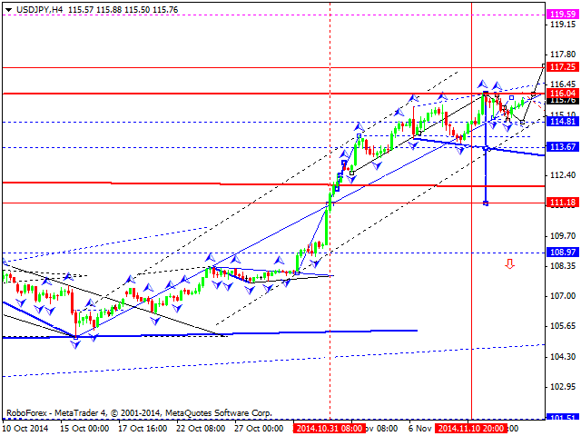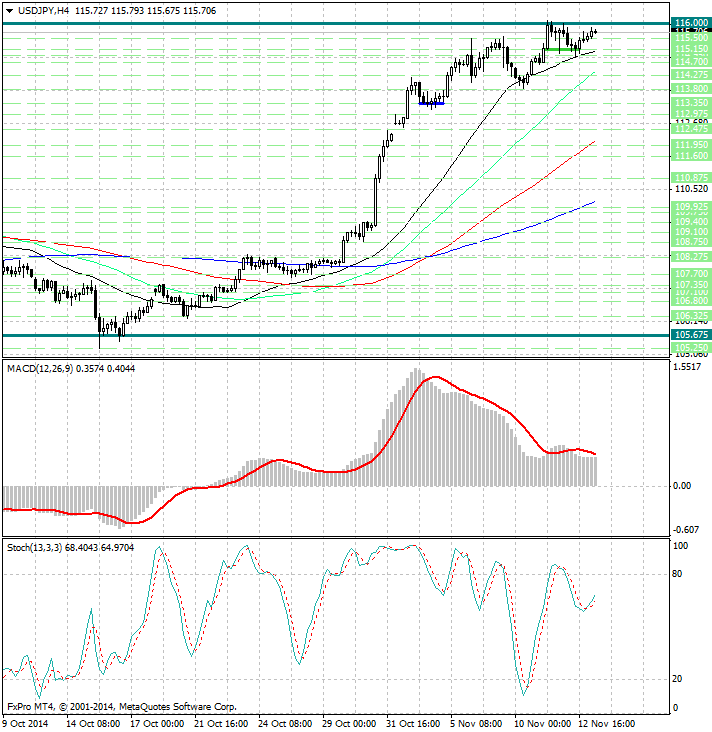 Курс валюты расположен значительно выше скользящих средних с периодами 34, 55, 89 и 144, которые направлены вверх и указывают на сохраняющиеся бычьи настроения (в среднесрочной перспективе), а также являются рядом уровней поддержки 115.05, 114.40, 112.10 и 110.10.