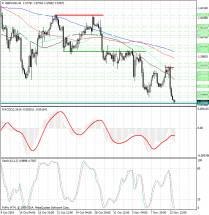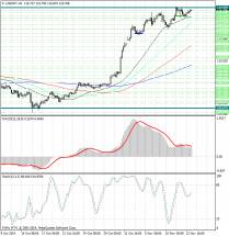 Курс валюты расположен существенно ниже скользящих средних с периодами 55, 89 и 144, которые направлены вниз и указывают на сохраняющиеся медвежьи настроения (в среднесрочной перспективе), а также являются рядом уровней сопротивления 1.2470, 1.2550 и 1.26175, и слился со средней с периодом 34.