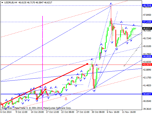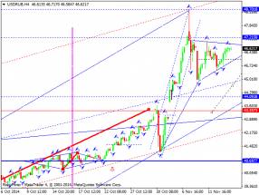 Российский рубль продолжает торговаться в консолидационном диапазоне. Не исключаем рост на отработку теста снизу уровня 47.21.Далее будем рассматривать развитие структуры снижения на отработку уровня 44.09.