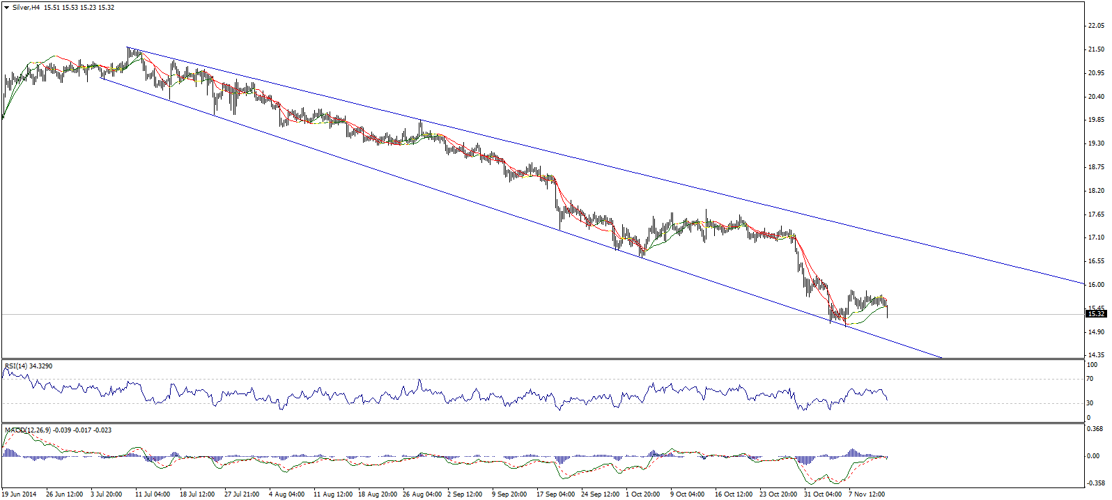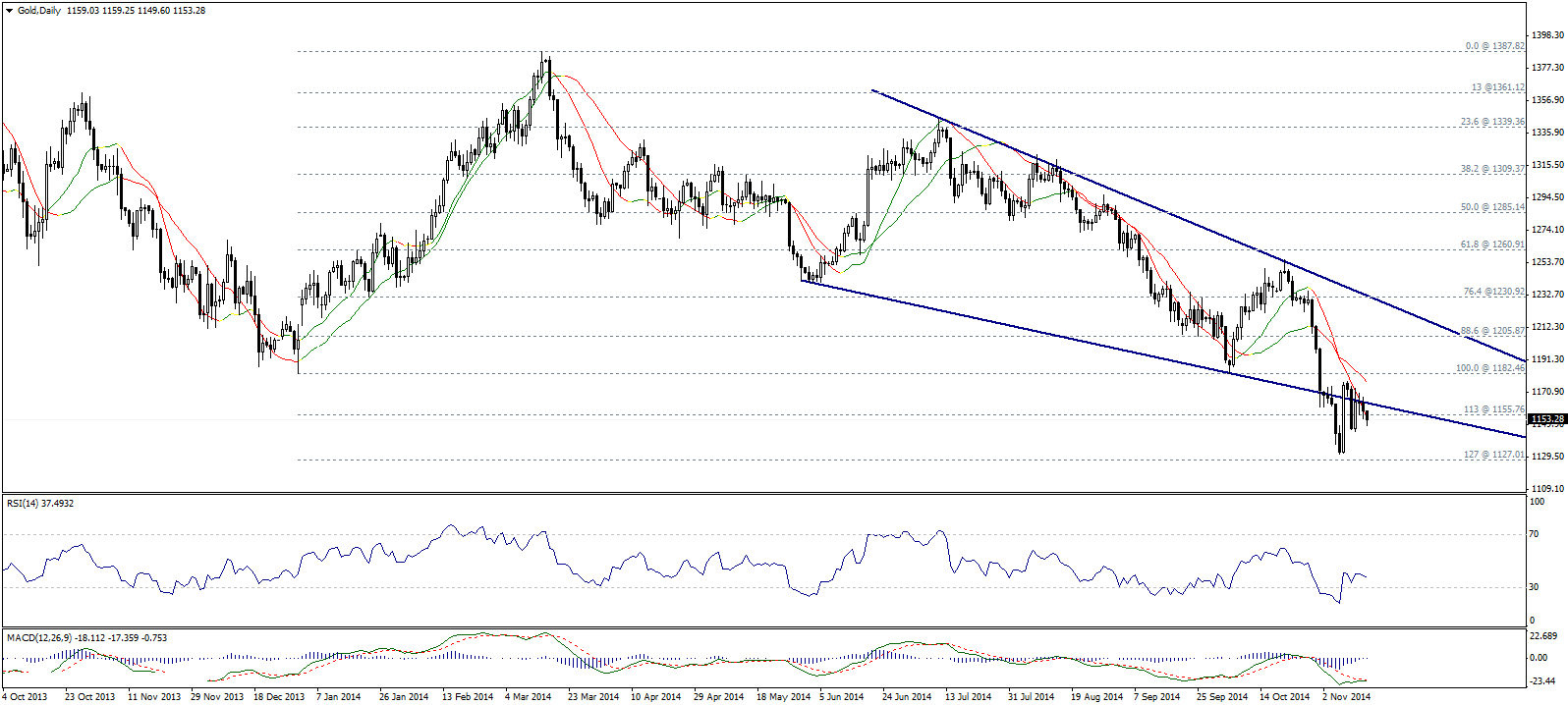 Золото пробило уровень поддержки 1155,75 (113% коррекции Фибоначчи) и этот фактор очень негативно сказывается на торгах. Мы считаем, что при поддержке от отрицательных линий Линейной регрессии, снижение продолжиться вплоть до области поддержки 1127,00 (127,% коррекции Фибоначчи). Имейте ввиду, что рост металла выше отметки 1155,75 отменит медвежий сценарий.