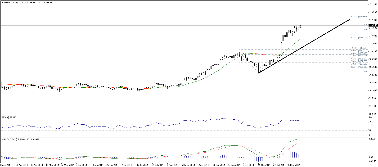 Курс валюты по-прежнему расположен значительно выше скользящих средних с периодами 34, 55, 89 и 144, которые направлены вверх и указывают на сохраняющиеся бычьи настроения (в среднесрочной перспективе), а также являются рядом уровней поддержки 115.275, 114.80, 112.625 и 110.45.