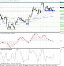 Курс валюты зажат между скользящих средних с периодами 89 и 144 (уровни сопротивления 0.87225 и 0.8740) с одной стороны и средних с периодами 55 и 34 (уровень поддержки 0.8665) с другой.
