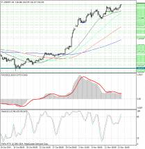 Гистограмма MACD по-прежнему расположена в положительной зоне и немного выше своей сигнальной линии, продолжает очень плавно повышаться и тем самым подает сигнал на покупку USD/JPY.