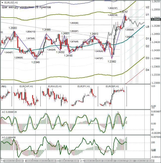 Возвращение евро выше 1,25 стало позитивным сигналом для дальнейшего восстановления. Утром в Азии курс евро/доллар вырос до 1,2576. Рост остановился на 135 градусе. Учитывая, что сегодня понедельник, жду откат к линии lb. Для продолжения восходящей коррекции курс EUR/USD в не должен упасть ниже 1,2485/80. Как только пара пройдёт 1,2600, откроется дорога к 1,2711 и далее к 1,2886.