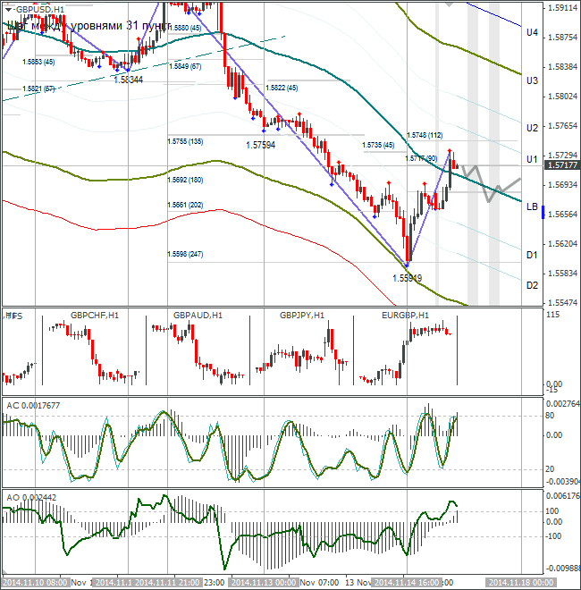 Спекулятивный фактор, который оказывал дополнительную поддержку паре USD/RUB, И это, если и не будет способствовать укреплению рубля, то, во всяком случае, замедлит его падение. Хотя для нисходящей коррекции есть несколько поводов. Во-первых, это, уже названная ранее, перепроданность российской валюты. Во-вторых, все же не исключена некоторая стабилизация цен на нефть, что также должно поддержать рубль. Свою лепту могут внести и итоги первого годового аукциона РЕПО в валюте, но только при условии, что не повторится история с его краткосрочными аналогами, когда банки не проявили к инструменту достаточный интерес. Однако, напряженность в Украине сохраняется, а на встрече G 20 российского президента встретили достаточно прохладно. К тому же появились разговоры о возможности того, что Владимир путин покинет сами раньше его окончания. Поэтому не стоит исключать возможность того, что пара откроется гэпом вверх и предпримет попытку вернуться к ранее достигнутому максимуму (48,6285). Ну и, конечно, не стоит забывать о возможно объявлении новых санкций. Но негатив для рубля мы увидим лишь в случае расширения санкций секторальных.
