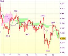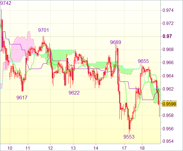 Вчера пара опустилась до отметки 0,9553, после чего произошел уверенный скачок вверх. Тем не менее зона 0,9655-60, скорее всего, ограничит рост. Затем возможно очередное падение. Пробой зоны 0,9570-75 укажет на окончание восходящей волны от 0,9553 и, вероятно, снова направит пару вниз к данному уровню. Если отметка не устоит, то можно говорить о возобновлении непостоянного падения от максимума 0,9742 и откате недавней восходящей волны вплоть до 0,9544, а затем до 0,9500-10.