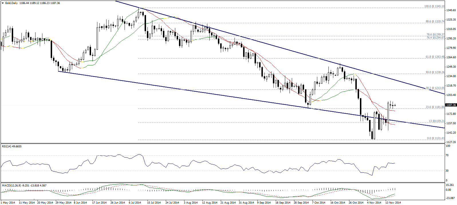 Несмотря на колебания в узком боковом диапазоне, вчера металл торговался стабильно выше уровня 23,6% коррекции Фибоначчи (1181,80), а так же выше линий Линейной регрессии. Учитывая так же положительный MACD и попытку RSI пробить отметку 50 вверх, мы ждем расширения восходящего движения с пробоем уровня 1181,80. Наша цель находится на уровне 1213,05 (38,2% коррекции Фибоначчи).