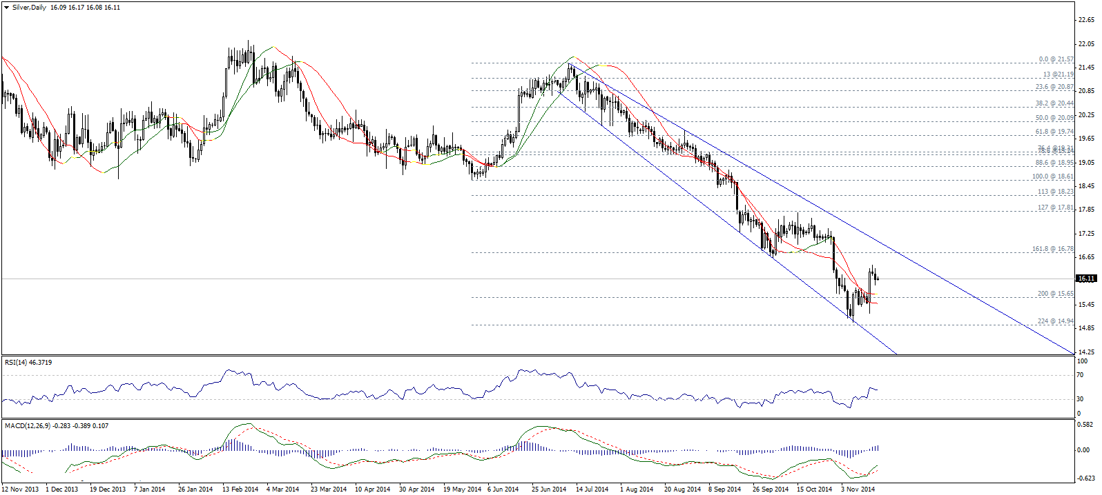 Вчера металл консолидировался выше уровня 16,00, что наряду с положительным кроссовером MACD и позитивным RSI указывает на возможность дальнейшего роста.