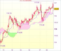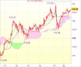 В связи с этим не рекомендуется открывать позиции на данной волне вверх. Предпочтительнее пока оставаться вне рынка. Пробой линии Киджун-сен (116,12), вероятно, продлит процесс консолидации ниже вчерашнего максимума на 117,05. Затем может последовать падение до 115,80. Однако поддержка 115,46 должна устоять, после чего могут начаться «рваные» торги.