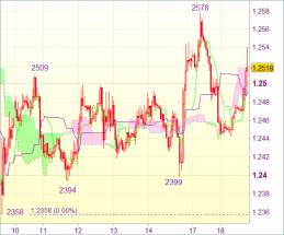 Курс валюты зажат между скользящих средних с периодами 89 и 144 (уровни сопротивления 1.25075 и 1.25925) с одной стороны и средних с периодами 55 и 34 (уровень поддержки 1.2460/575) с другой.