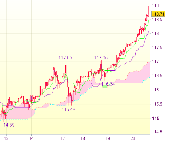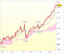 Поэтому предпочтительнее не открывать позиции на данном росте, а дождаться последующего отката до линии Киджун-сен (118,11) для покупки доллара. Далее вероятен очередной скачок вверх. Лишь пробой поддержки 117,40 вниз отменит данный сценарий и станет признаком формирования временного максимума. Затем пара может направиться к предыдущему сопротивлению 117,05.
