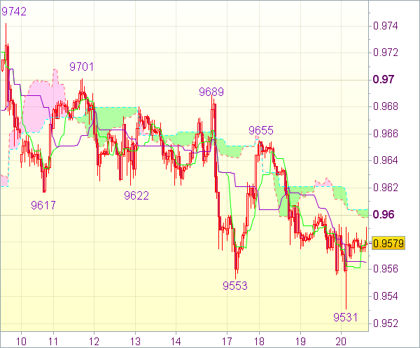 Пара снова стала падать и опустилась ниже предыдущей поддержки 0,9553. Короткие позиции от 0,9650 были закрыты на 0,9550 с прибылью в 100 пунктов. Краткосрочный нисходящий потенциал сохраняется. Непостоянное движение вниз от максимума 0,9742, вероятно, продлится до 0,9500-10. Тем не менее падение, скорее всего, будет ограниченным. Котировки вряд ли опустятся ниже поддержки 0,9442. Затем возможен рост.