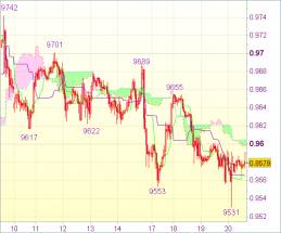 Поскольку прибыль по коротким позициям от 0,9650 уже зафиксирована, то пока не рекомендуется открывать сделки на данном падении. Предпочтительнее оставаться вне рынка. Пробой верхнего Кумо на 0,9606 укажет на формирование минимума и, вероятно, направит пару к 0,9630-35. Однако лишь пробой сопротивления 0,9655 станет признаком завершения коррекции от 0,9742. Затем возможен более сильный скачок вверх к 0,9689 (максимум 14 ноября).