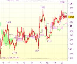 Накануне вечером единая валюта подскочила до отметки 1,2600. Однако последовавший далее откат указывает на возможную консолидацию ниже данного уровня. Также не исключен откат к нижнему Кумо (1,2508). Тем не менее лишь уверенный пробой отметки 1,2500 вниз укажет на образование максимума и, вероятно, направит пару к 1,2470-75. Однако только прорыв поддержки 1,2443 станет признаком завершения коррекции от минимума 1,2358 и, возможно, приведет к тестированию зоны сильной поддержки 1,2394-99. Как только зона будет пробита, пара снова обретет нисходящий импульс и возобновит движение вниз.