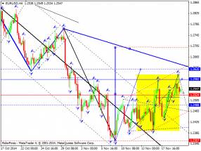 Здесь мы продолжаем следить за развитием нисходящей структуры от 5 ноября. Продолжения движения книзу, ожидаем после пробоя 1.1288, в данном случае цель – 1.1260, в коридоре 1.1260 – 1.1234 консолидация. Пробой уровня 1.1234 должен сопровождаться развитием выраженного движения, здесь цель – 1.1177. Потенциальным значением для низа, считаем уровень 1.1150, по достижении которого, ожидаем консолидацию. Краткосрочное восходящее движение, возможно в коридоре 1.1344 – 1.1362, пробой последнего значения будет располагать к развитию восходящей структуры, здесь потенциальная цель – 1.1394. Основная тенденция – нисходящая структура от 5 ноября.