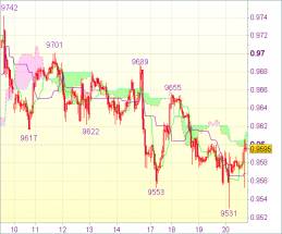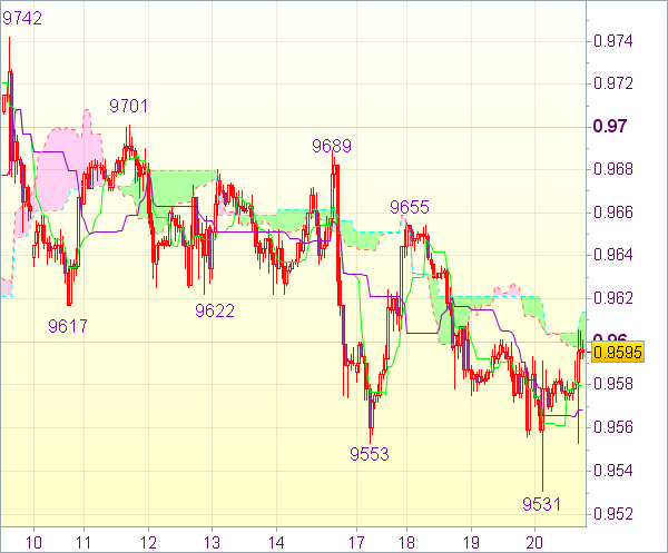 Как и ожидалось, пара направилась вниз. Поскольку доллар обрел поддержку на 0,9531 и стал набирать позиции на торгах в Европе, далее возможна консолидация. Также не исключено тестирование верхнего Кумо (0,9614). Однако лишь пробой зоны 0,9630-35 станет признаком формирования минимума. Затем пара может протестировать сопротивление 0,9655. В случае пробоя можно рассчитывать на завершение коррекции от 0,9742. Затем возможен более сильный скачок вверх к 0,9689 (максимум 14 ноября).