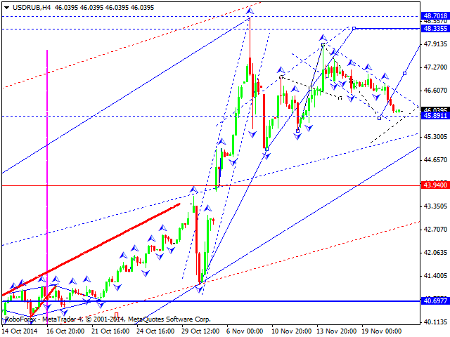 Российский рубль очень медленно спускается к отработке целевого уровня. Такой сценарий предусматривает развитие ещё одной структуры роста на обновление уровня 48.33. Далее ожидаем снижение на пробой уровня 45.00. А на формировании консолидации с фигурой продолжения будем рассматривать отработку цели на 43.94.