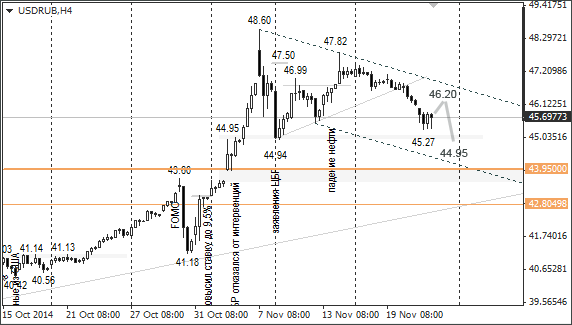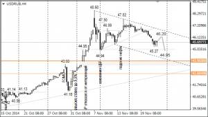 Курс Brent прошёл психологическую отметку в 80 долларов за баррель. Если восстановление цен на нефть продолжится до уровней 82,15 и 84,80, доллар снизится до 45 и 43,95. Уровень 43,95 соответствует цене открытия 5 ноября, когда рынок открылся с гэпом.