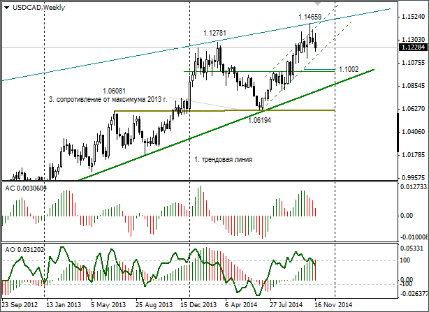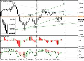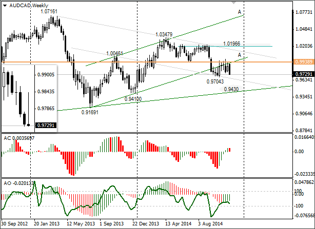 6 октября текущего года была опубликована идея по паре AUD/CAD. В ней я ожидал, что после выхода из восходящего канала «А» австралийский доллар снизится до 0,9430 к началу декабря 2014 года. Идея остаётся в силе, поскольку недельные свечи не закрывались выше 0,99.