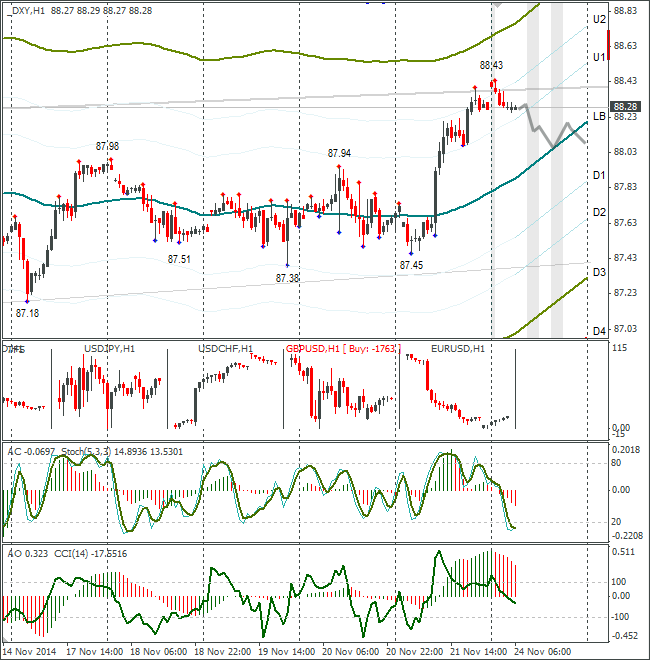 В понедельник рынок открылся ростом по доллару и к настоящему времени гэп полностью закрыт. Во вчерашнем обзоре я написал, что сегодня надо следить за динамикой канадца и австралийского доллара с долларом США. Они в пятницу укрепились и выросли с открытия торговой сессии. Так как сегодня понедельник, то мой сценарий против движения пятницы на возвращение DXY к линии lb.