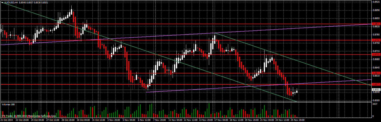 Цели достигнуты, задачи на текущую неделю по шортам выполнены, можно и коррекцию постепенно начинать. Вчера австралийский доллар обновил годовые минимумы, и добрался до нижней границы быстрого нисходящего канала зеленого цвета R4, от которой медведи начали постепенно фиксировать свои позиции, тем более что завтра в США День Благодарения. Свечной индикатор Heiken Ashi рисовал нам весь день красные крупные свечи, которые закончились тестом вышеуказанного уровня и всплеском объема, что также было дополнительным сигналом о завершении краткосрочного нисходящего тренда.