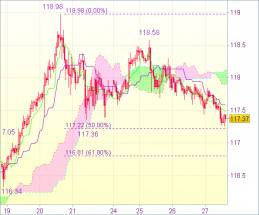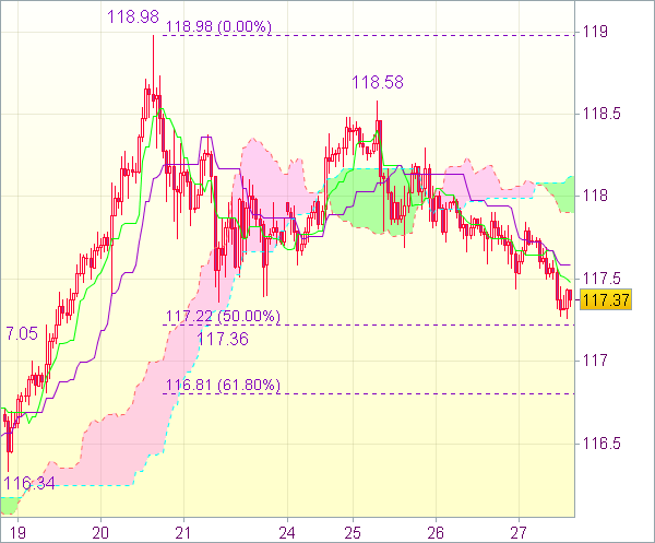 После непродолжительного роста доллар стал снова терять позиции. Это подтверждает наши предположения о возможном падении в ближайшее время. Движение вниз от максимума 118,98, скорее всего, приведет к откату недавней восходящей волны вплоть до 117,20-22, и далее до 117,05 (предыдущее сопротивление). Тем не менее зона 116,80-85, скорее всего, ограничит движение вниз. Затем возможен рост. Пробой зоны 117,80-85 укажет на образование минимума. Затем пара может протестировать верхнее Кумо (118,12). Однако лишь пробой 118,25-30 подтвердит наши предположения и, вероятно, направит пару к сопротивлению 118,58.