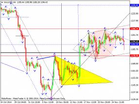 Золото продолжает торговаться с понижением в рамках консолидационной структуры. На сегодня будем рассматривать продолжение развития этой консолидации с понижением. Не исключаем теста уровня 1180. Далее ожидаем продолжение роста на отработку локальной цели на уровне 1235.