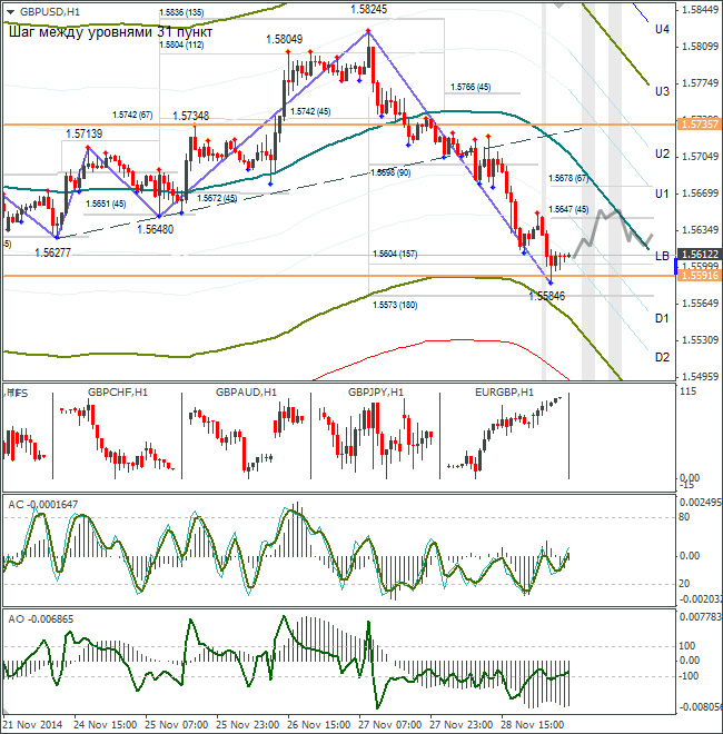 Британский фунт серьёзно просел в конце минувшей недели. Он вернулся к минимумам середины ноября. Евро/доллар пытается пробить дневную трендовую линию. Если рост евро продолжится, фунт/доллар тоже восстановится. Уровень 1,5590 является поддержкой. Так как сегодня понедельник, то мой сценарий на откат к линии lb против пятничного падения.