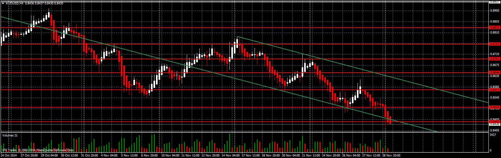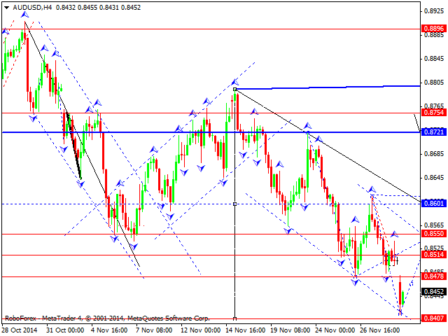 Торговать шорт можно продолжать, так как данных, свидетельствующих хотя бы о каком либо восстановлении AUDUSD в рынке нет. Шорт на пробой 0.8440, а также на пробой нижней границы нисходящего канала зеленого цвета R2 будет хорошим вариантом. Продавать AUDUSD также можно в случае ее коррекции к сильному сопротивлению 0.8500. В этом случае, все стоп приказы необходимо расставлять выше этого уровня на 7-10 пунктов. Основной целью шортов будет обновление годовых минимумов и падения в район поддержки 0.8732, где будет заметна первая фиксация прибыли. В случае появления на этом уровне объема я также советую прикрыть вам часть коротких позиций, так как может начаться более глубокая восходящая коррекция.